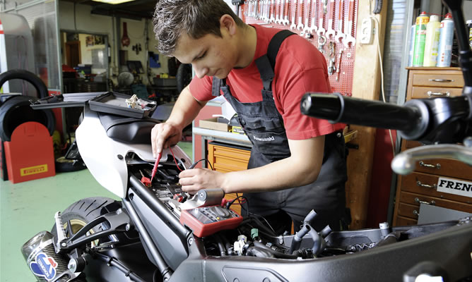 Wer schwere Maschinen liebt, ausdauernd ist und sich bei Motoren, Elektrik und Elektronik zu Hause fühlt, ist hier am richtigen Ort. Motorradmechaniker und Motorradmechanikerinnen nehmen die Kundenfahrzeuge an, beurteilen sie und führen die Aufträge fachgerecht aus. Dabei erledigen Sie sämtliche Service- und Reparaturarbeiten, montieren Zubehör und nehmen Einstellungen am Motor vor. Sie beraten Kunden bei Reparaturen und Service von Motorrädern aller Art. Weiter Infos unter www.zweiradberufe.ch